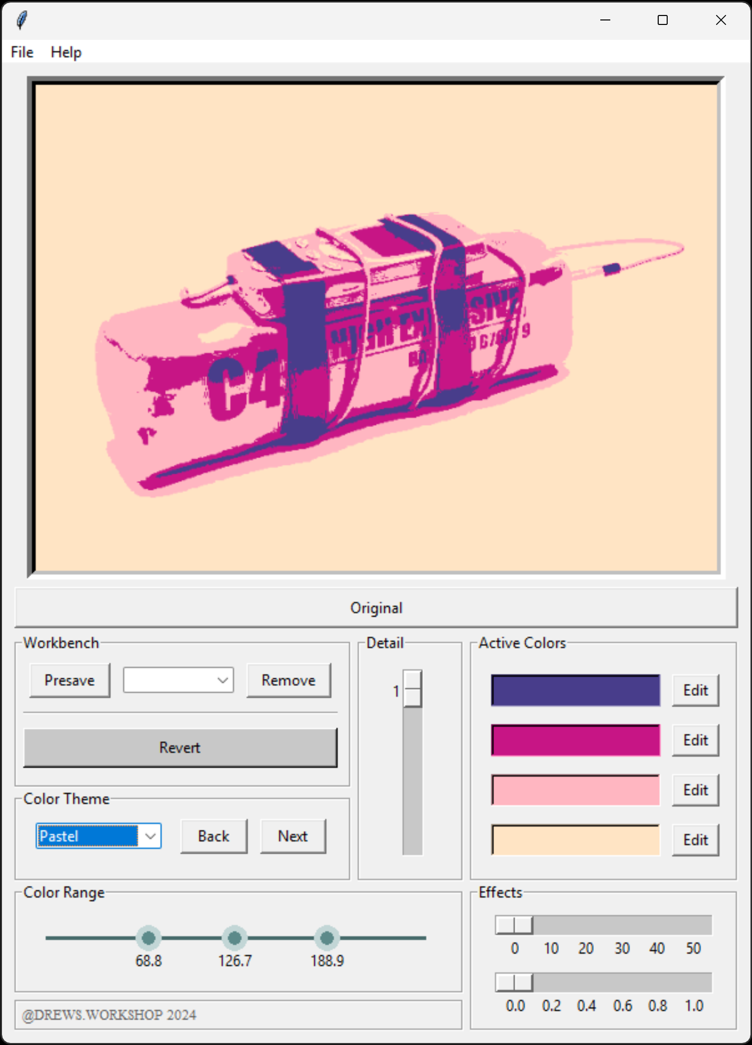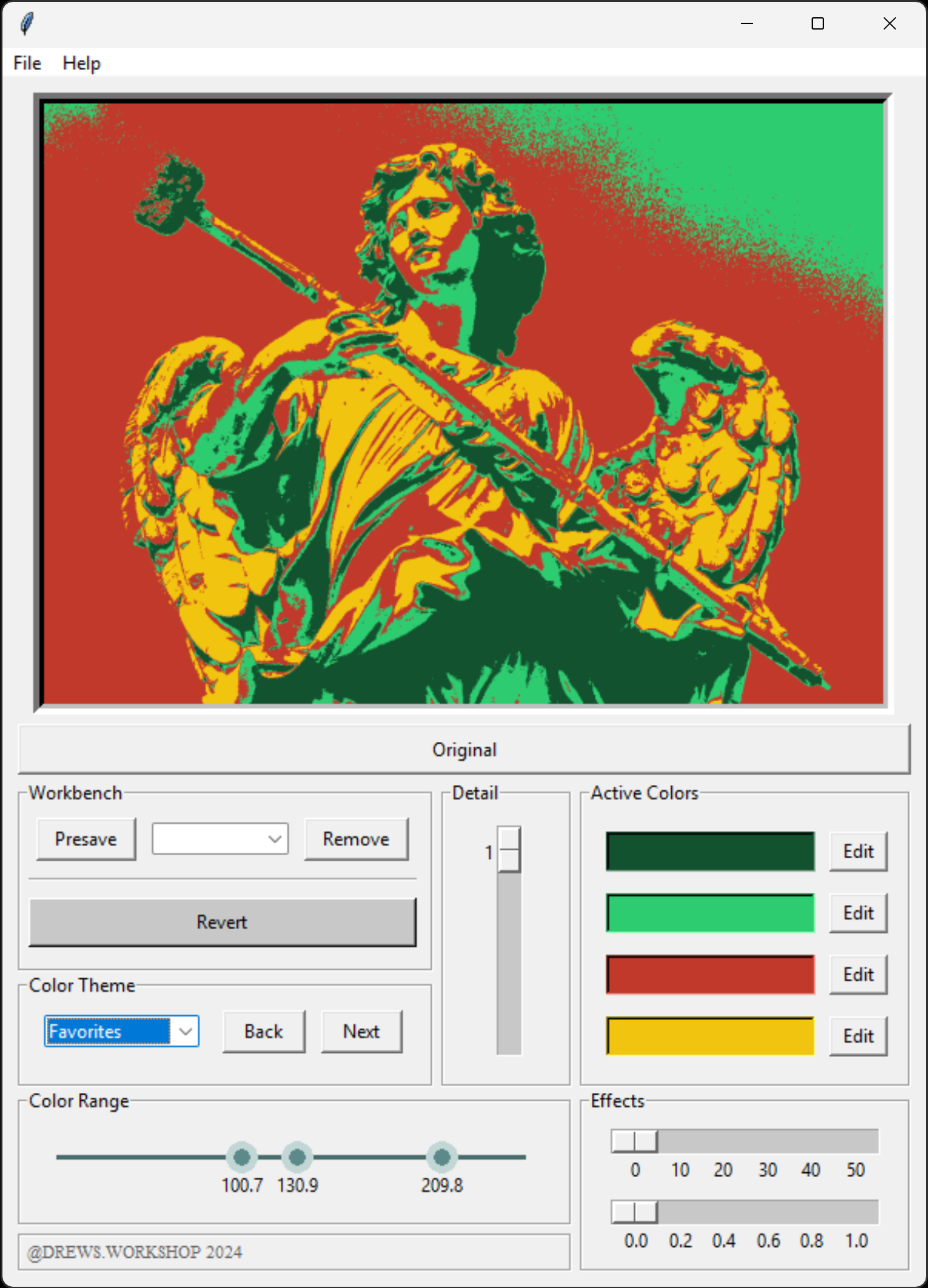 Photo editing tool made in Python. Simplifies an image to four colors based on brightness levels, which can be adjusted via a slider, to create a poster like effect. Preset color schemes can be used, or a custom color scheme can be created. Other features include adjustments of the feature details, pixelate the image, or a fisheye effect.